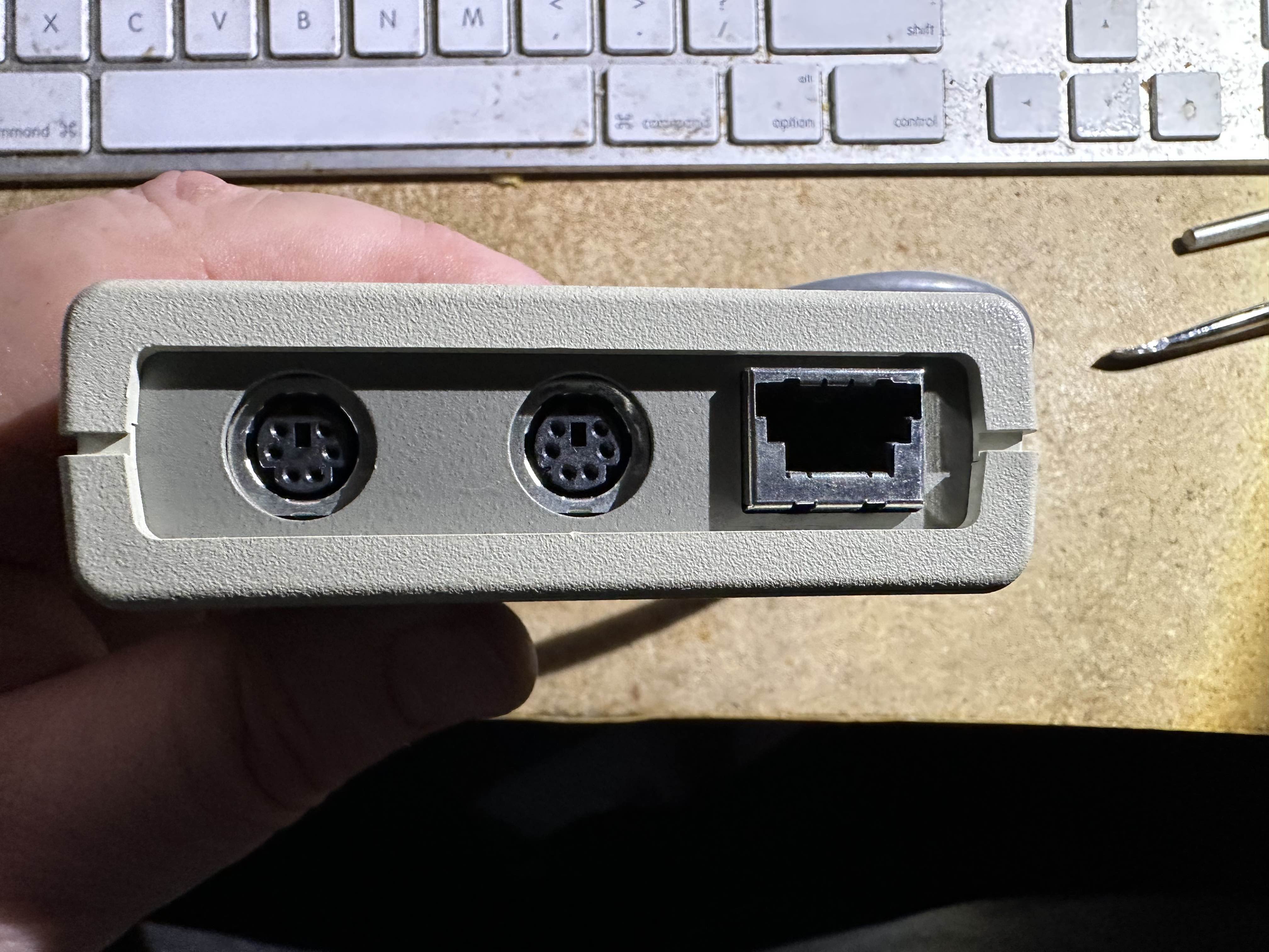 I'll take some pics of the hardware and email them to you. I think the mouse piggybacks onto the keyboard (like old adb macs).