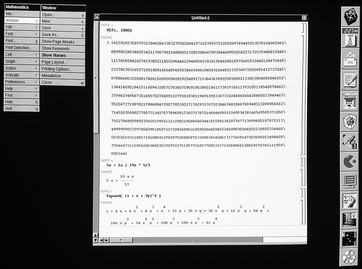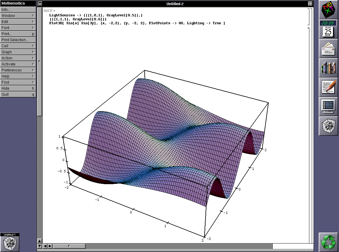 A software package I always had interest in on NeXT is Mathematica. I began with a cube 18 months ago running Openstep 4.2 with original Mathematica 2.02 floppies but no installed Mathematica (requires a Passcode to activate).