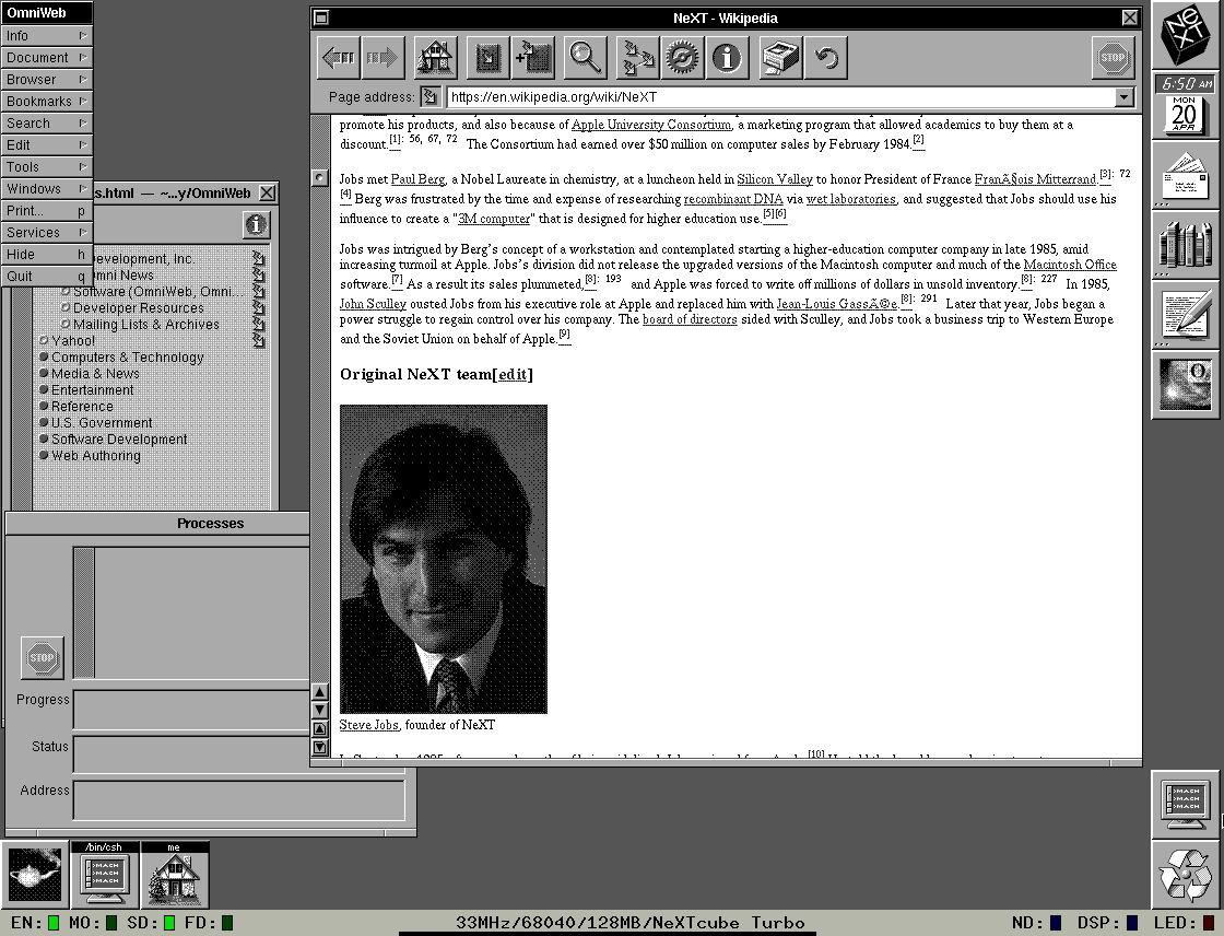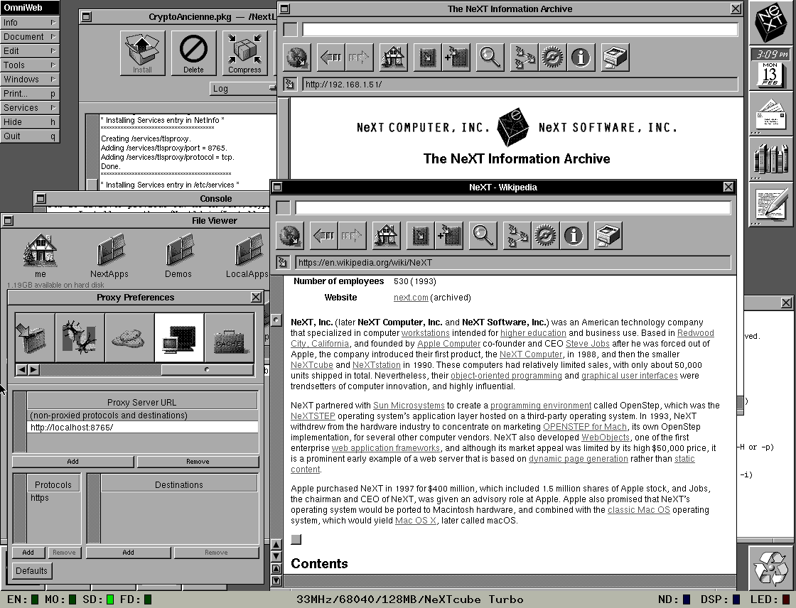 https://drive.google.com/file/d/1agqT8bvswQhOsYS94U2OmnlvCZEin6lb/view?usp=sharingOmniWeb 2.7b3 in NEXTSTEP 3.3 in VirtualBox in macOS 10.13. WRP is running in macOS.