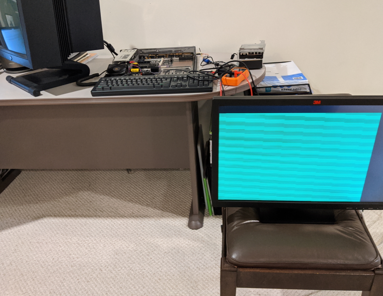 As mentioned, the board has been cleaned, and I do plan to re-cap. Everything powers up -- the fan, the LED, the hard drive and the floppy. A clean and steady 12v can be read from the 12v pins on the video connector.