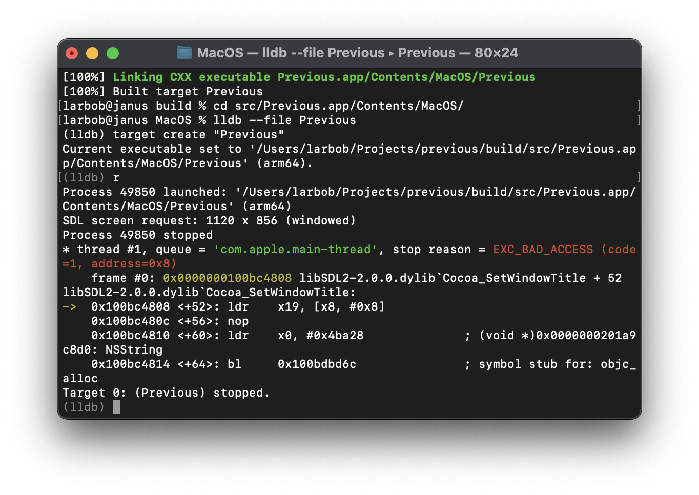 Current executable set to '/Users/larbob/Projects/previous/build/src/Previous.app/Contents/MacOS/Previous' (arm64).