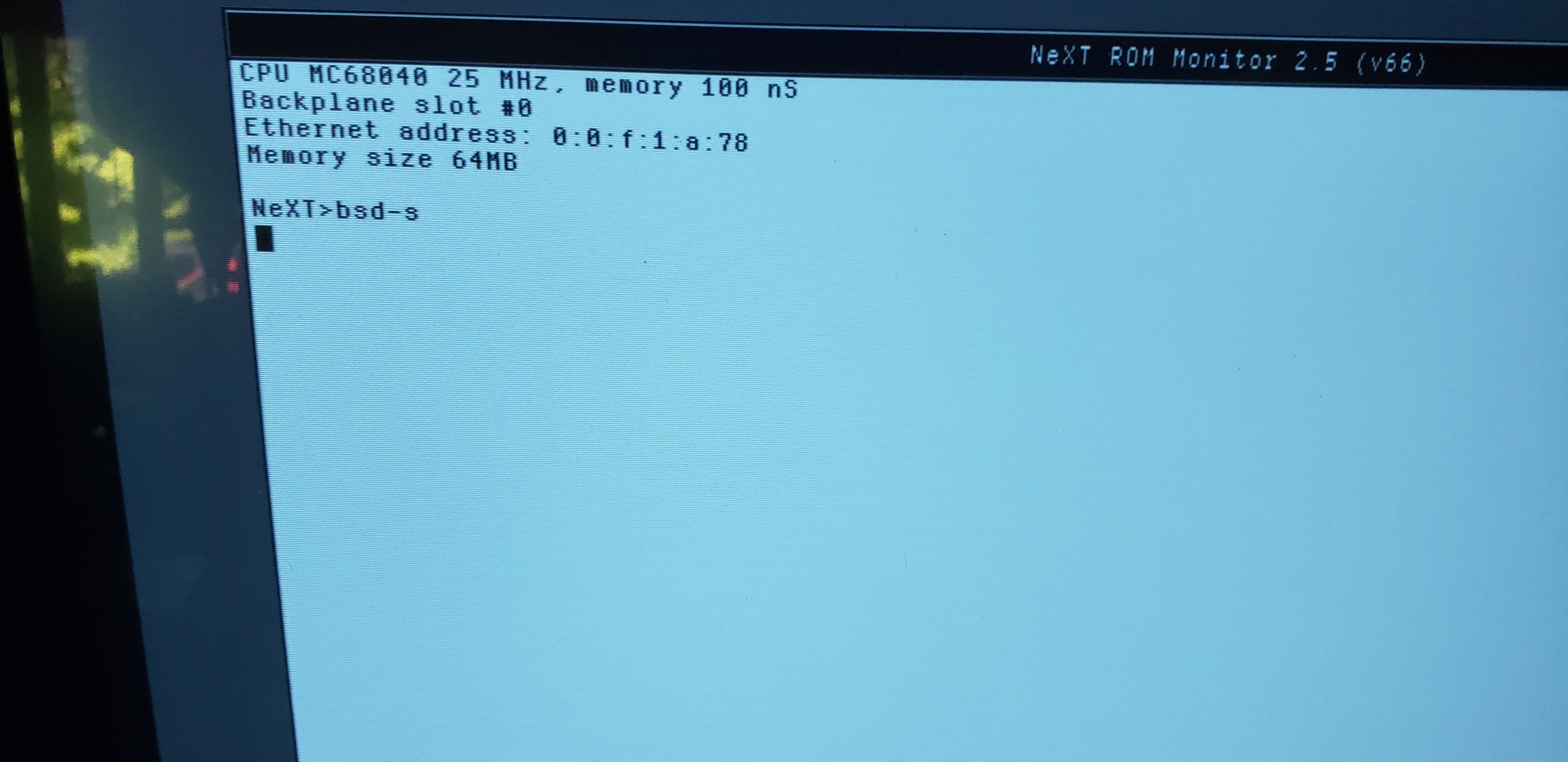 Working on a cube that i have not powered on in a few years. Boots to the login screen no problem, but i have no clue what the login info is for this machine. So I decided I would go in and follow the steps to reset the password. I can boot into ROM monitor just fine, but when I try to use bsd -s the system just hangs with a solid block. I have left it to run for over 30 minutes and not getting the expected #prompt to continue. (note, screenshot does have a typo of no space in the bsd -s command, but I did try it with it properly typed as well)
