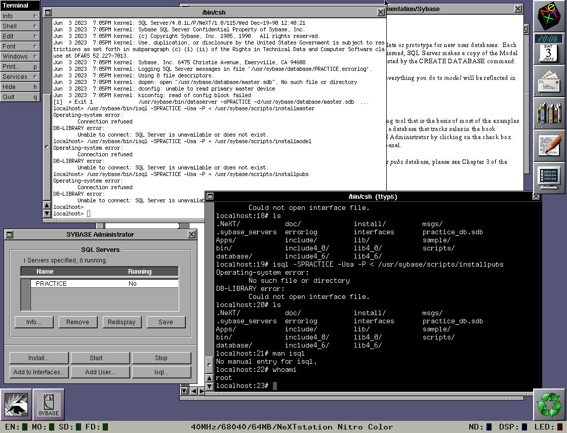 Quote from: crispin on May 13, 2023, 11:36:06 PMI don't think Sybase runs in NS Intel, I am pretty sure its 68k only. I had to run it on my NeXT Cube back in the day when I did development with EOF.