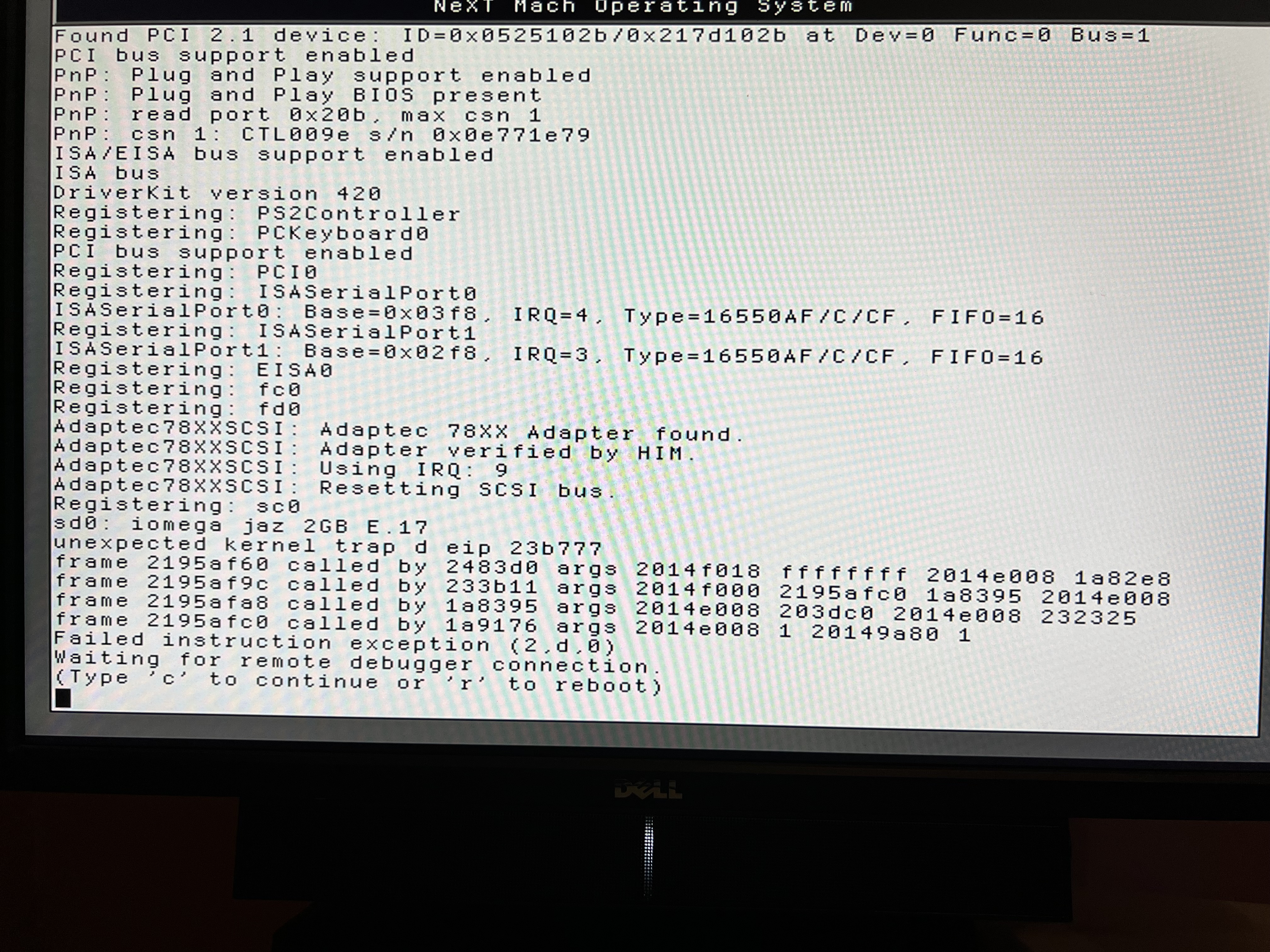 The SCSI Jaz drive works correctly under OPENSTEP (mounts, writes and reads, tested with several cartridges) and there's no media in it at the time of this panic. Nevertheless, I'll try temporarily disabling the Adaptec SCSI driver to see if it helps.