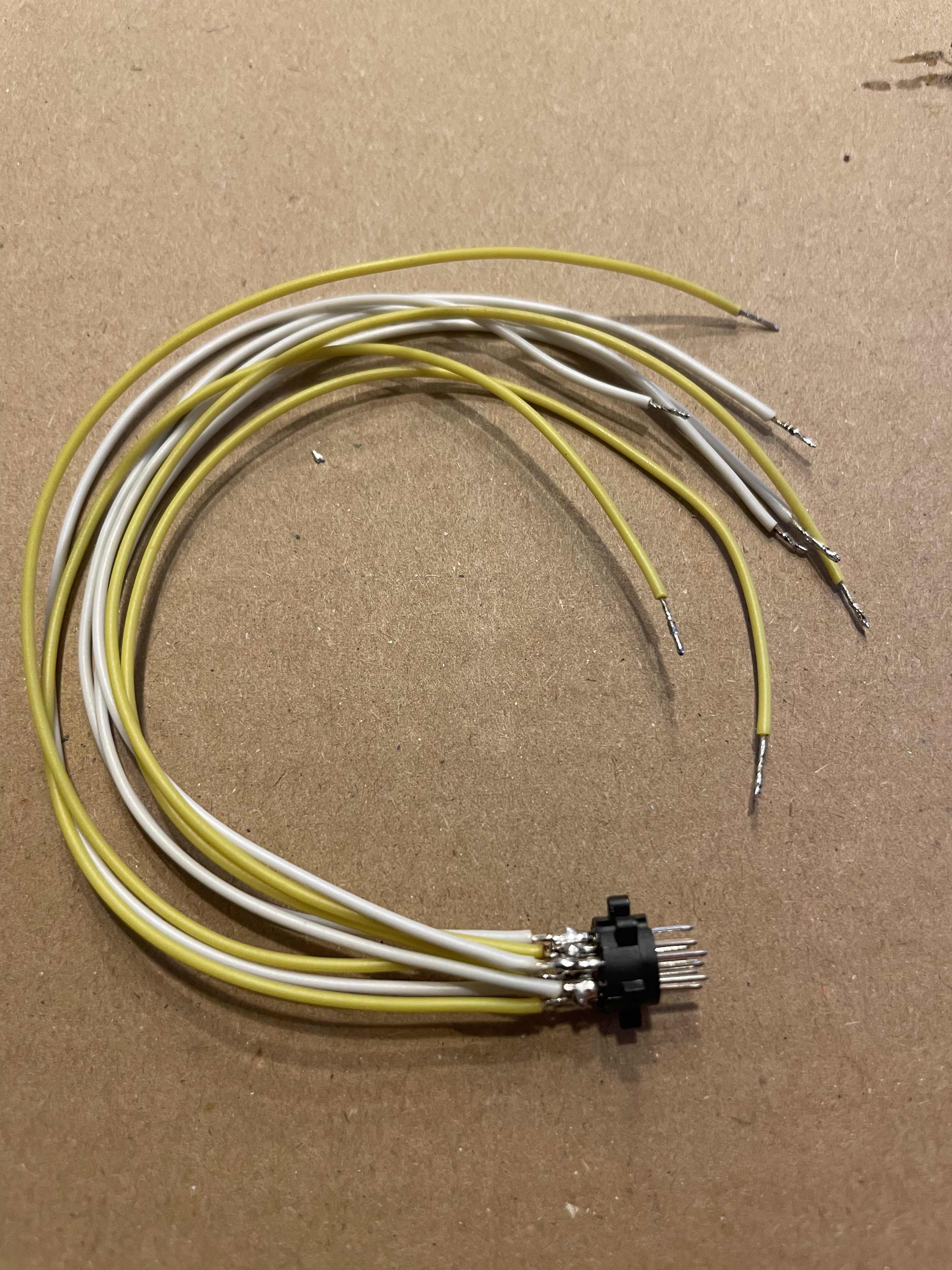 Wires on the mini DIN-8 pin connector with markers for the pinout: