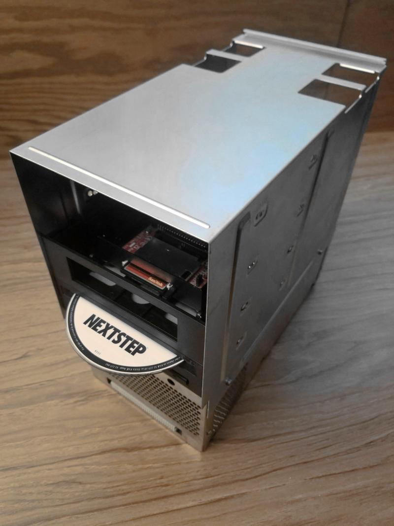I disassembled the cube yesterday and cleaned out the interior. Yikes! The dead optical drive was replaced with a slot load DVD SCSI drive. The drive faceplate was painted satin black years ago as detailed in another thread. The original hard drive was backed up and set aside. I added a temporary Compact Flash IDE > SCSI drive to use for setup and testing. The NeXTcube case is a little beat up and missing the front logo so I'm going to move the parts to a nicer cube.