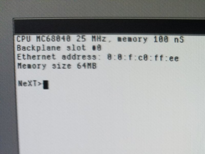 I get a single '@' character when starting up the NeXT instead, no idea what that means... with the original ROM and serial console enabled in NVRAM, I can access the serial console.