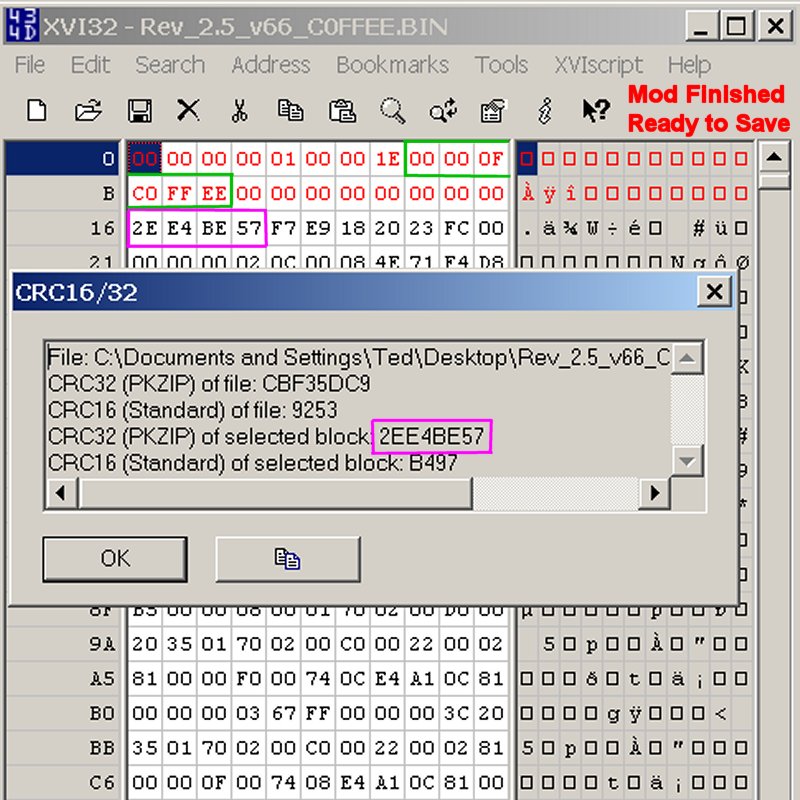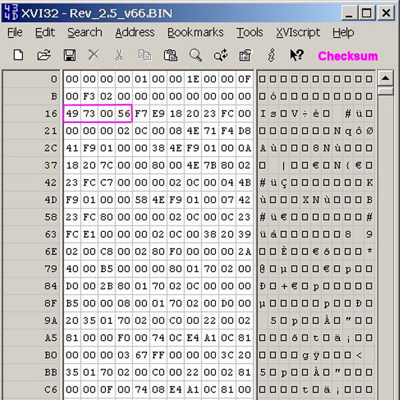 A new checksum (not shown) was calculated with the XVI32 hex editor (