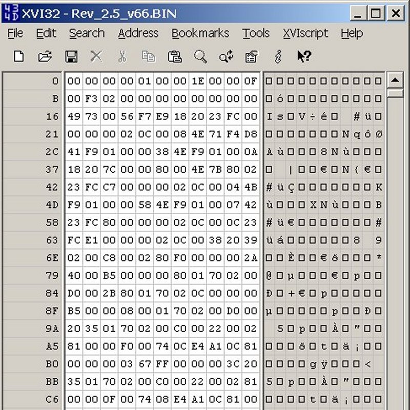 https://www.nextcomputers.org/NeXTfiles/Software/ROM_Files/68040_Non-Turbo_Chipset/Rev_2.5_v66.BIN)) from the archives. Next load the ROM file into your favorite hex editor. I like the XVI32 hex editor (