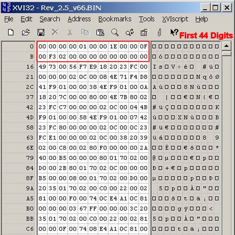 http://www.chmaas.handshake.de/delphi/freeware/xvi32/xvi32.htm). I use a small trick to make the code a little bit easier to read. If your hex editor allows it then resize the window so that you have 11 columns of hexadecimal pairs, which is 22 hexadecimal digits per row as shown below. Hexadecimal digits are 0-9 or A-F.