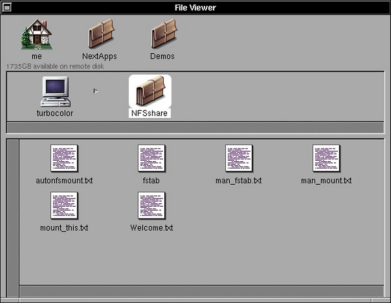 It took quite a bit of wrestling with different settings to get things working but I was finally able to simultaneously connect to the NFS/Samba server with a Turbo Color running OPENSTEP 4.2, a PC running Ubuntu 22.04 and another PC running Windows 10. If you look under the OPENSTEP home icon below it says "1735GB available on remote disk", which is ~1.7TB. NFS for the win.