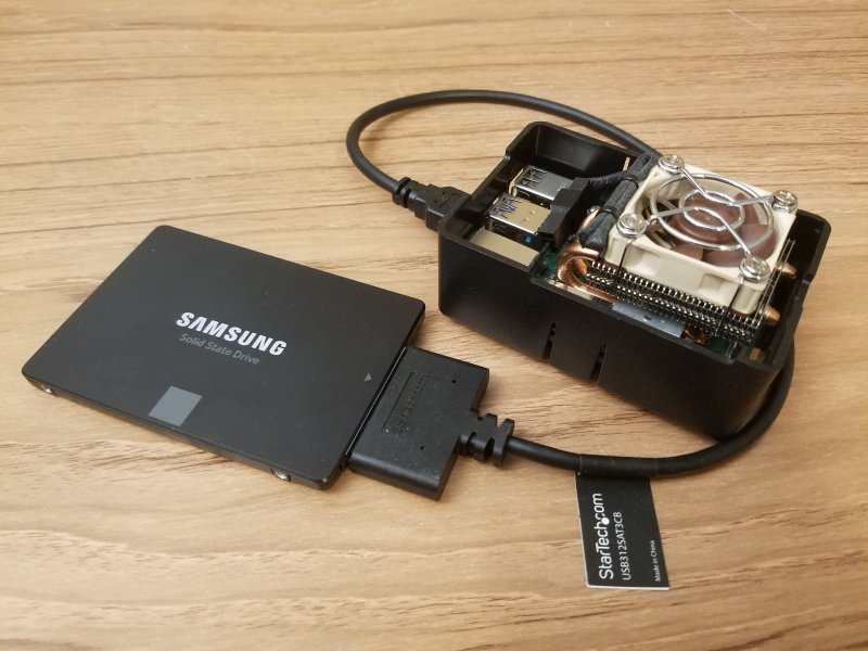 https://www.ninamakes.co.uk/builds/next-computer-replica-raspberry-pi-case/). The file storage/boot drive is a Samsung 2TB SSD with a StarTech (USB312SAT3CB) SATA to USB adapter. I tried two other SATA to USB adapters that didn't work, so I consulted this web page (