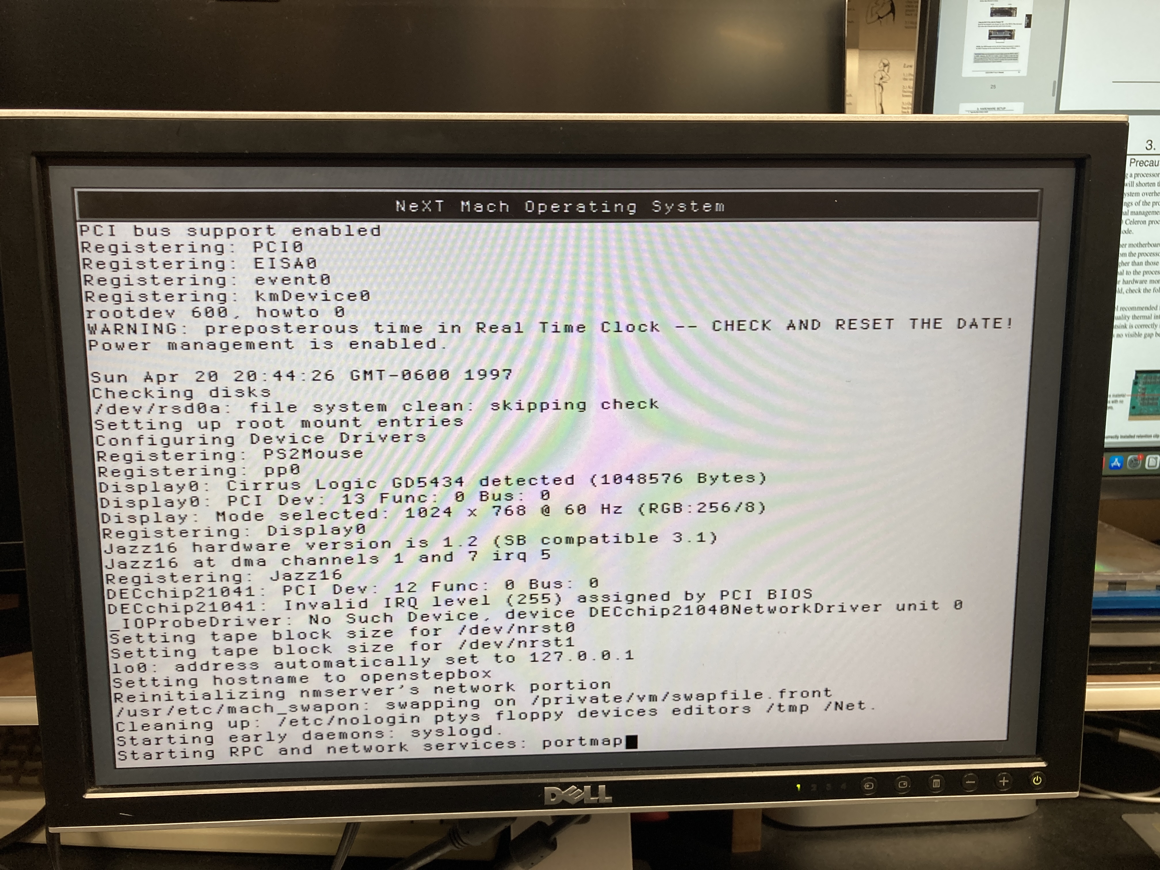 I started with a 3COM 3C905 NIC and was getting the following error in the bios "Invalid IRQ Assignment". I tested the card in another machine and it's working. I thought that because it was a 3rd party driver I'd try another card. I found a card with a DEC 21X4X chipset on it, and Open Step's configure.app recognizes the card, so I thought I was home free, however, when I boot with the -v flag, I'm still getting this same error. (See attached image).