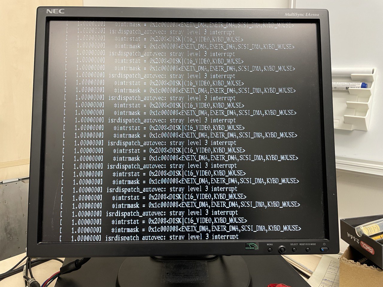 First, my trusty old TurboColor. The machine can boot the kernel but complains about a stray interrupt 3 without end. Back to non-Turbo NeXTs for now - I think Tsutsui mentioned in the changelog that only Turbo Cubes are (experimentally) supported. Unfortunately, that's the NeXT machine I don't own...