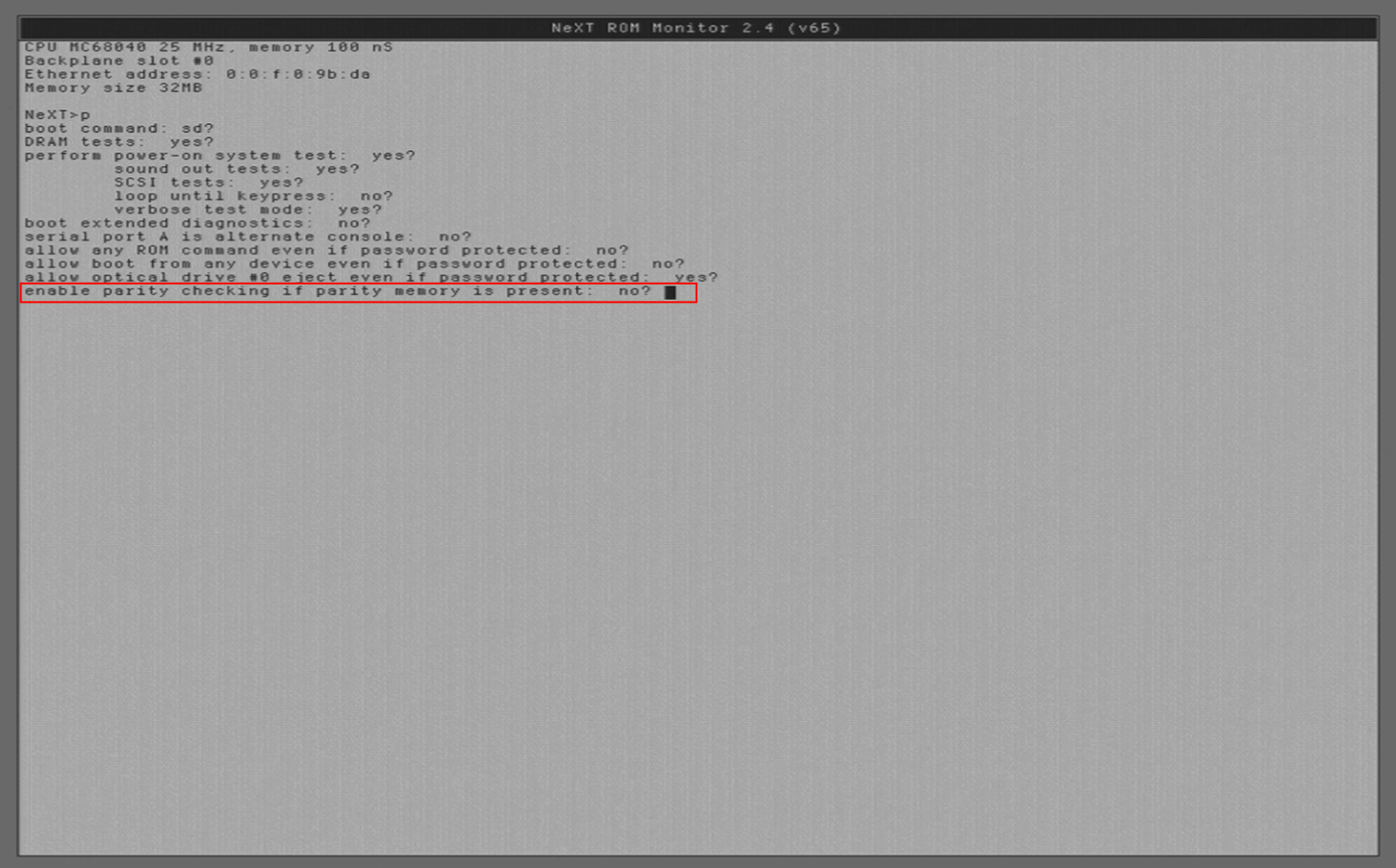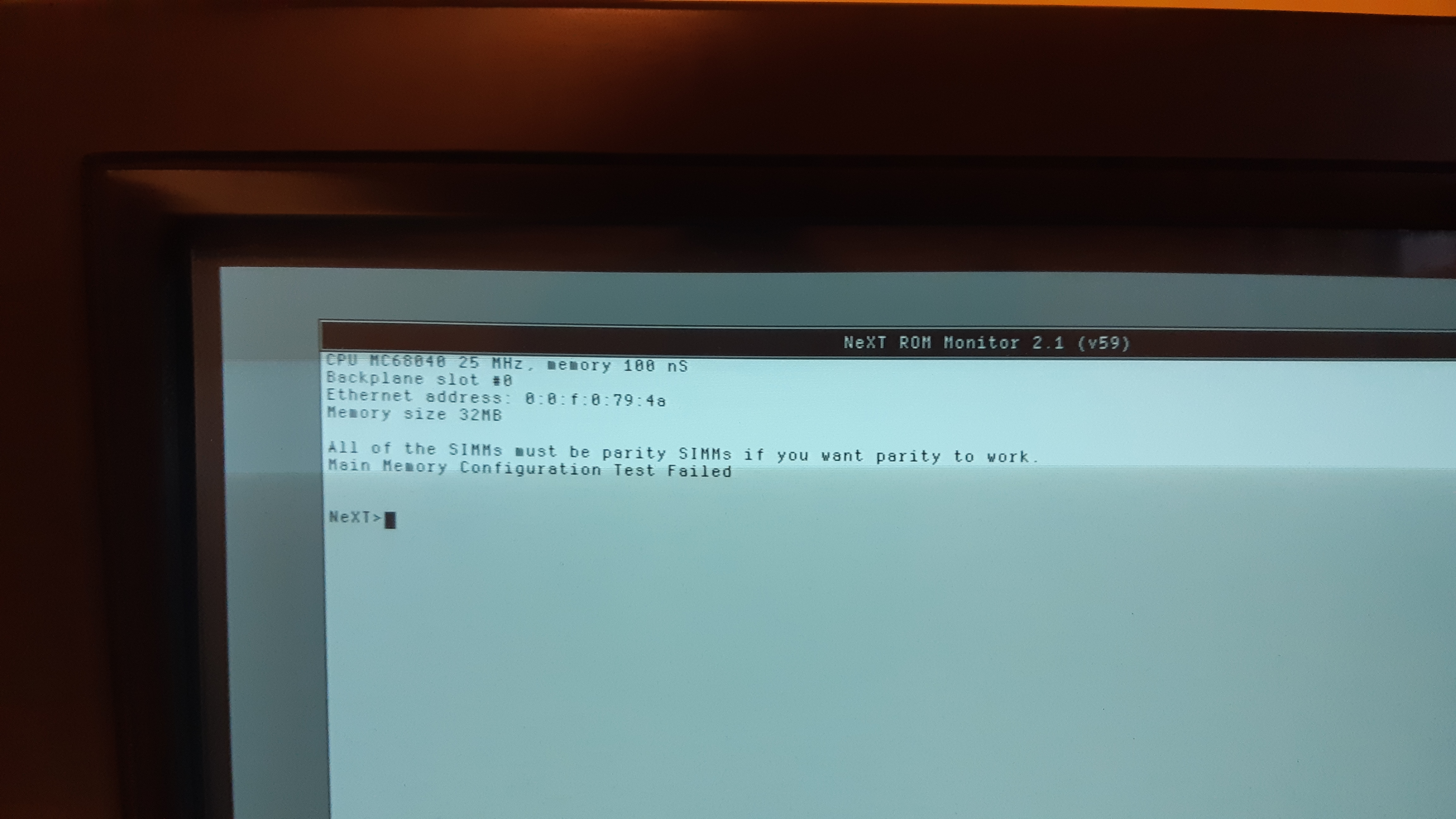 I have this NeXTstation and recently changed the RAM, mismatching RAM with/out parity. The POST fails but then I can go into the monitor (COMMAND + COMMAND + Backtick) and simply type bsd and it boots and runs fine.