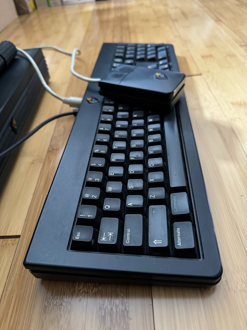 Working, but in rough shape. The keyboard has a loose rubber gasket and the mouse is missing it entirely. The mouse also had its cable replaced with a white one by the previous owner.