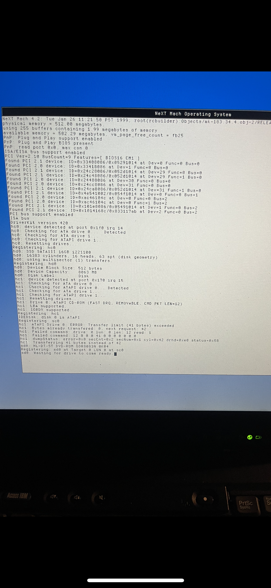 I did attempt to install OpenStep on the T42p. I chose the EIDE v4.03 drivers from the CD, and ran the installer. Then tried to figure things out, and did install the EIDE.pkg that included v3.37, which overwrote files. I did this by mapping a physical IDE drive (16 GB but only formatted 8 with the installer ((3.5GB visible during part of install))) to VirtualBox. It all boots fine with the USB to IDE adapter going into VBox. In the laptop, it says no operating system found.