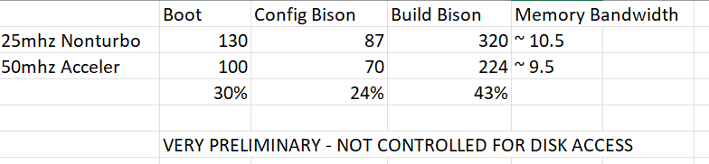 clock doubler type accelerator as I'm implementing leaves the bus speed unmodified; it isn't overclocking the logic board and requires no major modifications to the board. Turbo systems require a jumper installed to reduce BCLK to 25. So, CPU speed becomes 50mhz but the bus remains 25mhz. Work that can be entirely done within the CPU's caches receives the biggest performance increase, but IO activity like SCSI access remains exactly the same.
