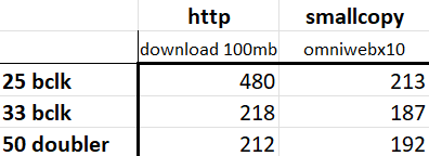 I found that curl takes *a lot* of CPU time to draw its status. It looks like you're well advised to use the silent switch on large downloads: that increases speed by 2x or more! Here's updated benchmarks with that, and a small file copy benchmark. This continues the trend that IO performance is essentially identical to a 33mhz system (despite 25mhz bus speed) but anything involving primarily CPU like compiling, rendering, and daily use benefits nicely.
