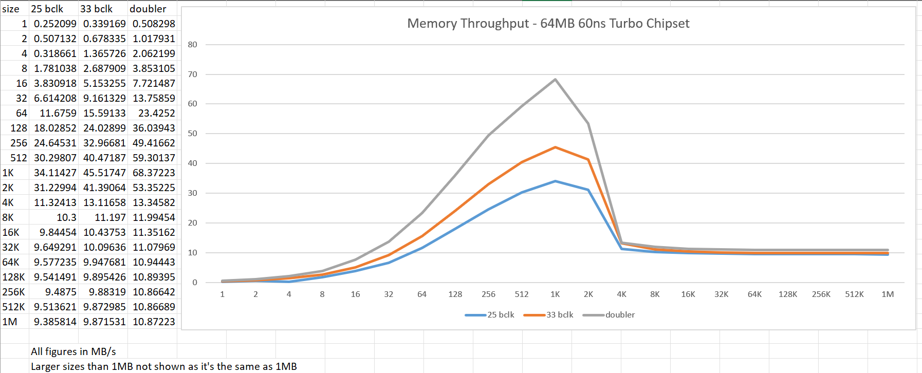 Copying a bit from my post on 68kMLA: Due to efficiencies elsewhere the real-world throughput to DRAM via memcpy appears to be improved. Below 4K cache sizes, the speed increase is linear since that's entirely within CPU caches. Above that is where DRAM performance comes into play. I'll have to write a simple assembly memory benchmark at some point to get closer to the maximum as who knows how effective the C memcpy implementation is. Still, it's a very good sign for practical use.