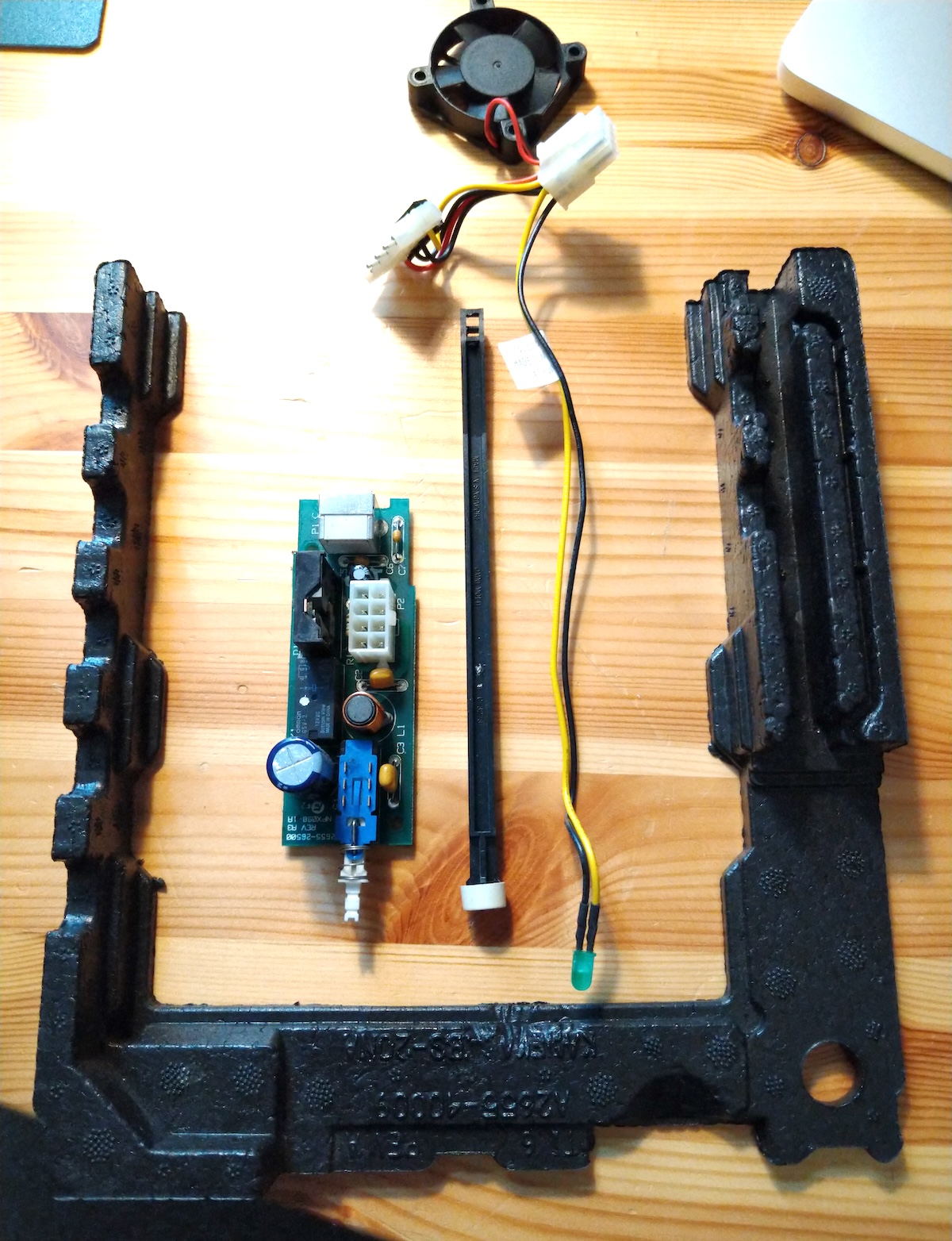 The PSU connector was labeled as 12V DC on the case but the connector was a 4-pin mini DIN so I had to take the PCB out to figure out the pinout. From google searches I expect the original PSU having been a 12V 1.65A unit.