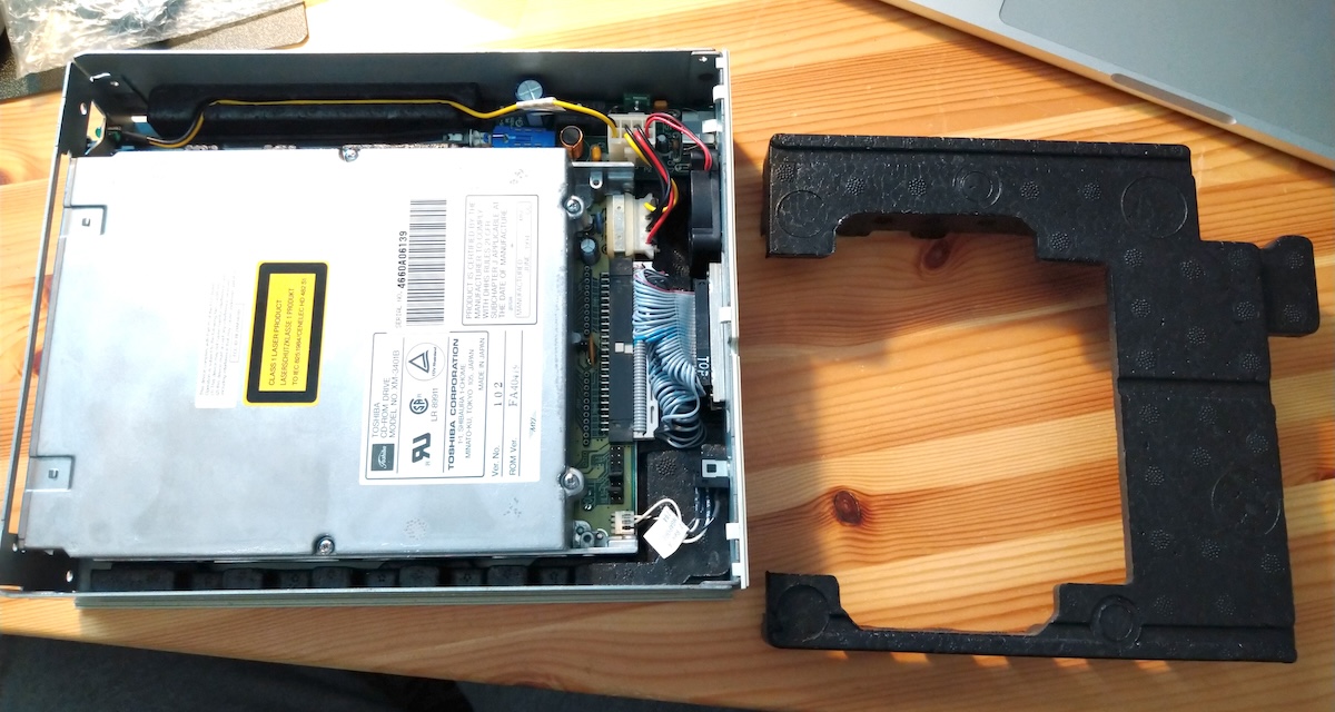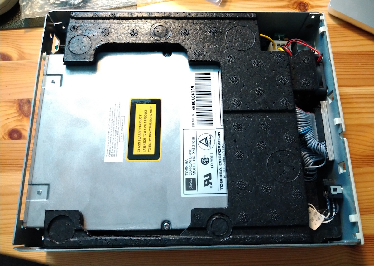 Some time later the drive arrived, looking slightly scratched and yellowed (at least compared to the computer) but nothing drastic. Even the two plastic clips that hold the top cover on were still intact.