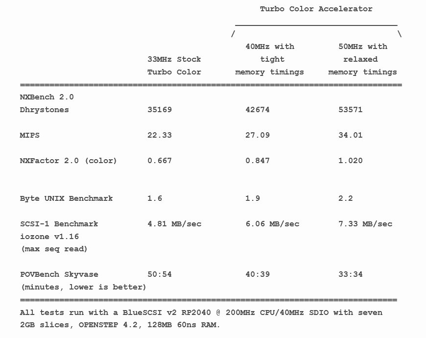 Rob's friend that currently recaps logic boards should be able to do the installation for those who want that service. Also, at some point I'll be selling some of the Turbo Color slabs I have that are already converted. It's been fun doing optimizations and running the benchmarks. I thought I would have grown tired of it by now but I haven't. My NeXT machines have gotten more use over the last year while developing this than the previous decade.