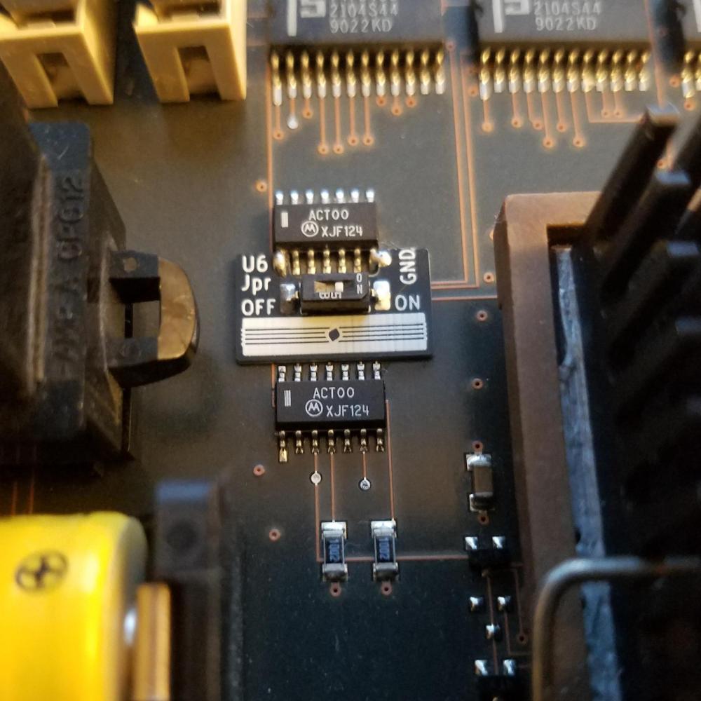 50MHz OverclockFor 50MHz overclocks it's necessary to replace the CPU with a 40MHz 68040. The onboard 70MHz MC88915FN70 clock driver (located under the floppy drive) will also need to be replaced with a 100MHz MC88915TFN100 or faster chip. You can replace this chip yourself or pay someone to do it for you. The PLCC socket shown in the picture above is not necessary for chip replacement. One last modification is a short bodge wire jumper on the U6 component located near the battery. This makes the logic board think that it's running at 33MHz which sets relaxed system and VRAM memory timings. This is only needed for 50MHz overclocks.