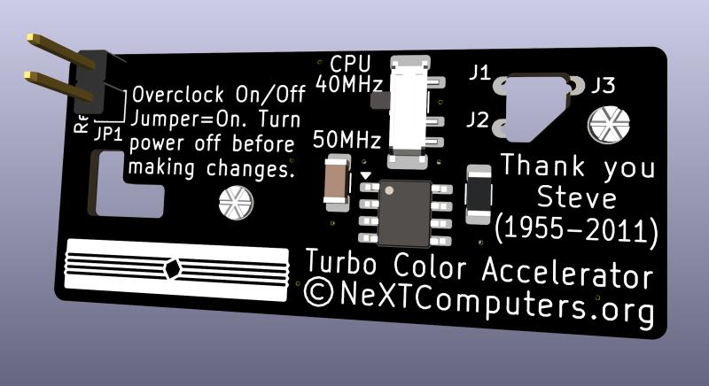 One of the new features of the PCB design is that it eliminates the prototype style wires connecting the accelerator to the logic board. All connections are made directly from the accelerator to the NeXT board, ensuring that the connections are as short as possible. The accelerator mounts securely with solder pins in matching through holes. The PCB includes a 2-pin jumper to turn overclocking on and off with either a jumper (supplied) or a user added 2-pin cable and switch. There's also an onboard micro switch that allows you to select either a 40MHz or 50MHz CPU speed. The combination of the two pin jumper and the micro switch allows the accelerator to run Turbo Color NeXTstations at 33MHz, 40MHz or 50MHz.