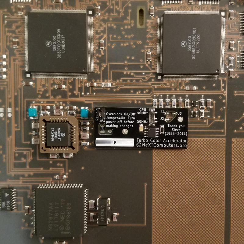 Cautions and DisclaimersI want to be transparent about this project so that you know what you're getting yourself into. There's always a risk involved when soldering on your NeXT, even during a recap. There are no guarantees that a given Turbo Color will overclock. However, extensive testing and benchmarking has shown that the 33MHz test machines run fine at 40MHz and not only produce noticeably higher CPU benchmarks but also faster video and SCSI benchmarks too. If your Turbo Color will overclock to 50MHz then the performance is even better. The Accelerators are sold as a kit that needs to be soldered, so consider that before you decide to get one.