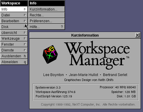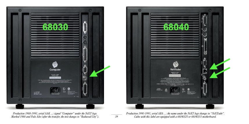 To determine whether you have a 68030 or 68040 processor, simply look at the back of the cube: the 68030 motherboard has only one Ethernet port, the 68040 motherboard has two (RJ and coaxial).