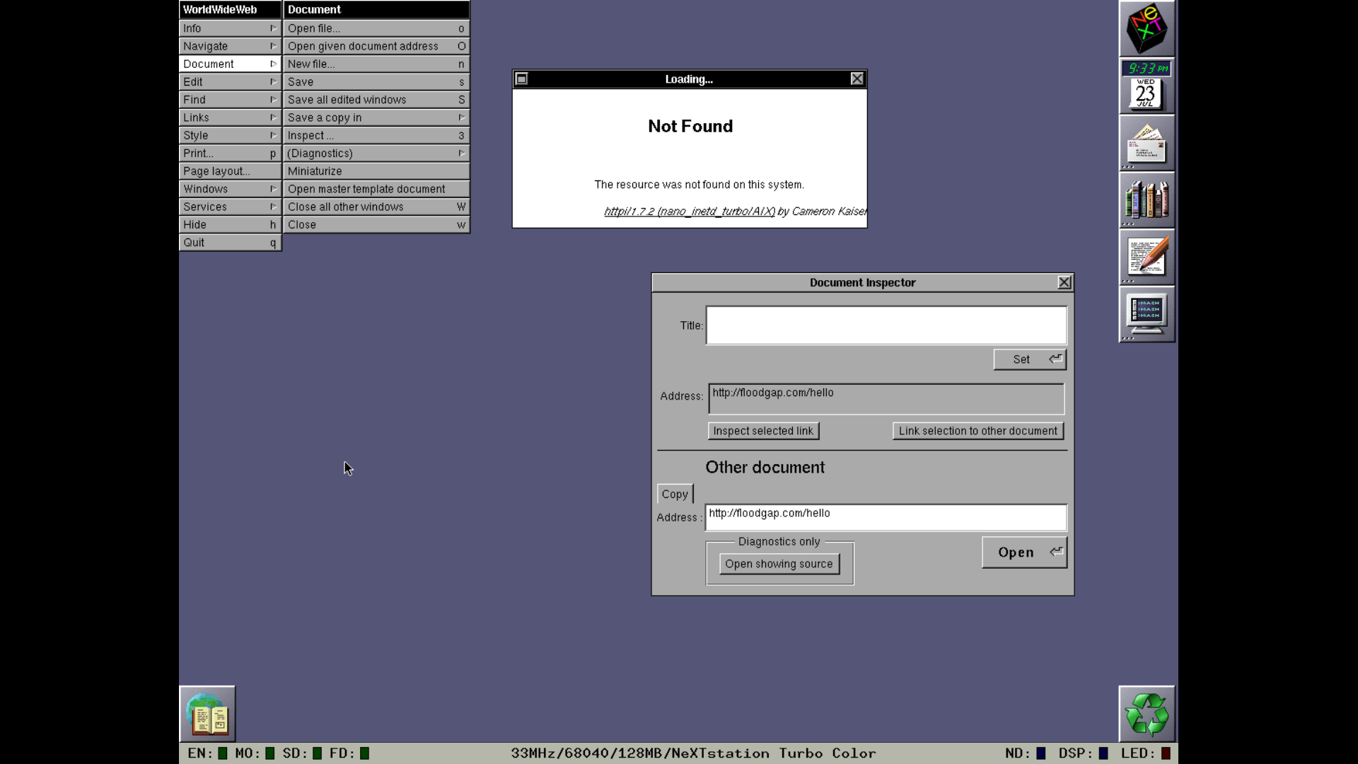 I really, really want to get the TBL apps working so I can give demos to high school students of what the Web was like in its earliest days and let them play around with that system as well. Does anyone have any ideas on what to try or past success with loading websites with 'Nexus.app' or 'WorldWideWeb.app?'