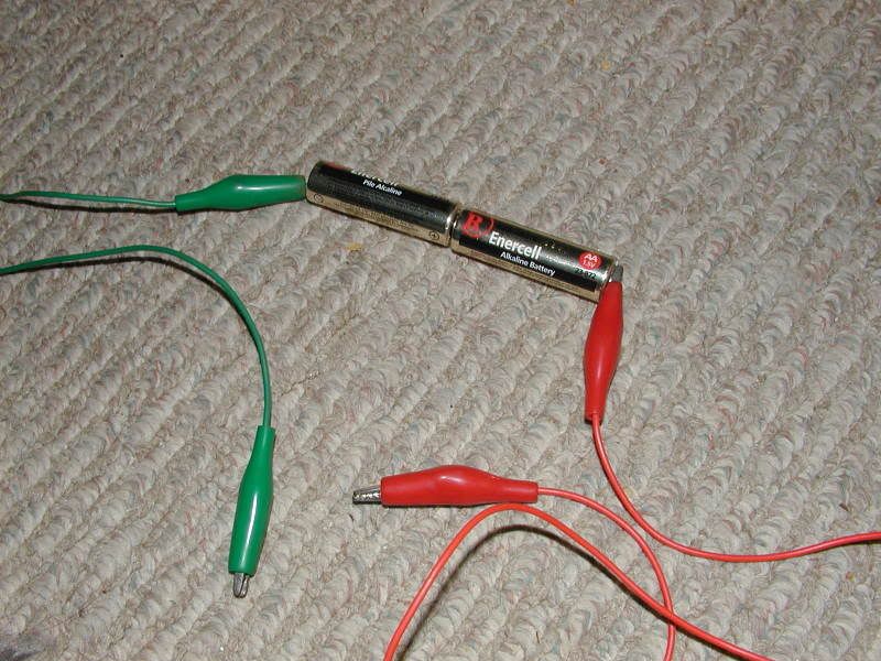 ^Two AA batteries connected together with duct tape and tinfoil and wires marked for their respective polarity.