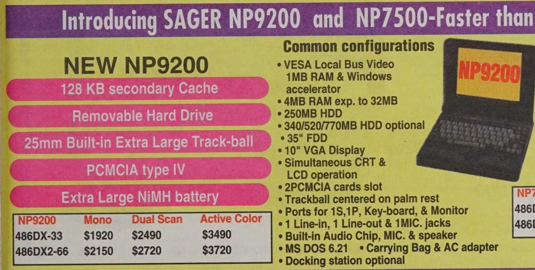 The 9200 was made by Sager, who often ran ads in Computer Shopper, MicroTimes, and other local Bay Area/nationwide free publications. It's unclear if they marketed the 9200 as a NeXT-specific solution or just a machine that happened to be well equipped for it (that plus a VAR install of the OS would go a long way). At least some 3rd-party ads positioned the "NP9200" without any kind of NextBook branding and as just a well-equipped DOS laptop: